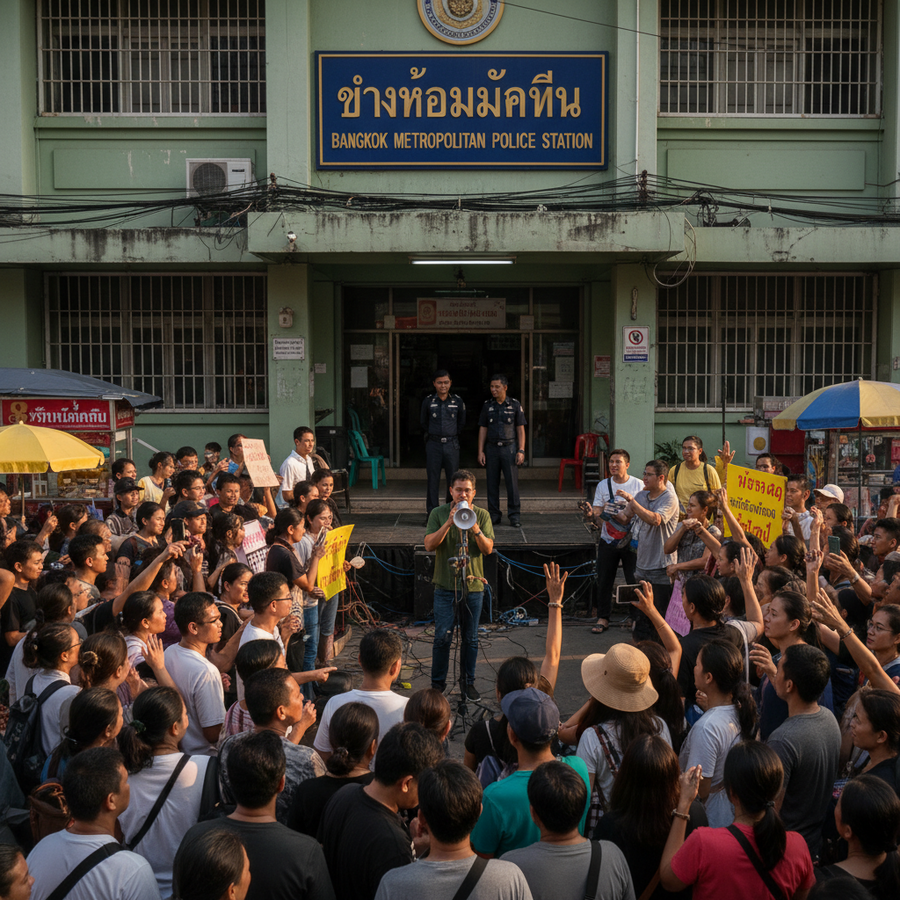 この事件がオンラインで報じられると、「ラチャグリタ・スポーツクラブの警備員2人が女性ライダーを蹴り、顎の骨を折って意識不明にさせた」という情報が広まり、約100人近くのライダーがパトゥムワン警察署の前に集結しました。彼らはこの不適切な行為に激怒し、ライブ配信を行いながら容疑者の警備員2人の顔を見ようとしました。警察が警備員2人を車両から降ろし、警察署内に入れようとした際、ライダーたちは彼らを襲撃しようと試みました。