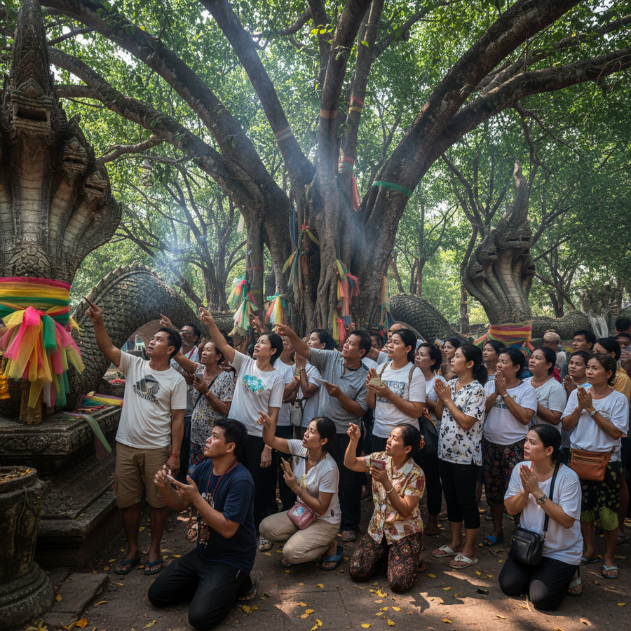 父プーと母メーヤーにお祈りをした後、人々はイチジクの巨木へと向かいます。地元の人々は、この木が父プーと母メーヤーの宝物庫だと信じており、カムチャノード島を訪れたら必ずお参りし、幸運を祈願します。まだ数字が決まっていない人々は、携帯電話のライトを使って幹をこすったり照らしたりしながら数字を探し、実際に75、57という数字を発見しました。偶然にも、父プーの像の腕にも5に似た数字が一つ現れたとのことです。
