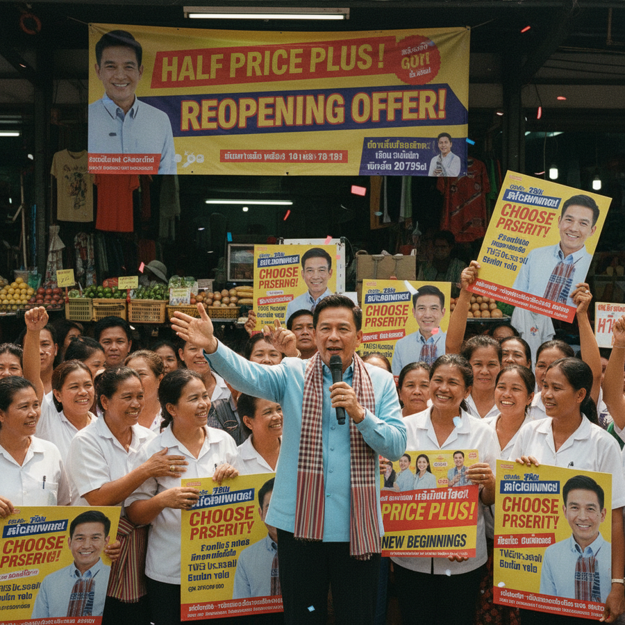プームチャイタイ党、クロンチャン市場で「半額プラス」再開を強調