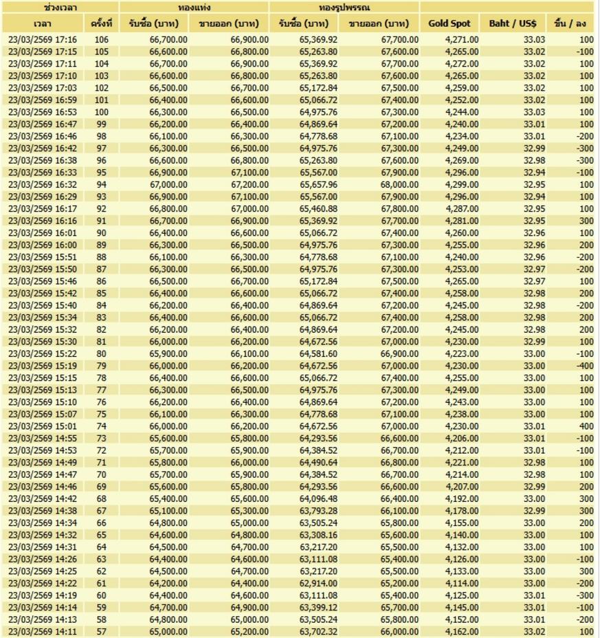 - 3月23日、タイ国内の金価格が1日で106回の調整を受け、合計3,550バーツ(約17,750円)の下落を記録しました。