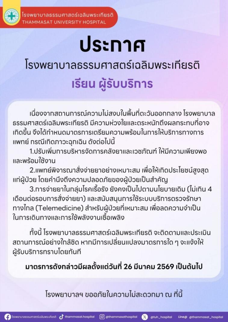 プラチャチャート・クルンテープ(Prachachat Krungthep)によると、タイ中部パトゥムタニ県にあるタマサート大学病院(Rongphayaban Thammasat Chaloem Phra Kiat)は、緊迫する中東情勢が世界的なサプライチェーンや経済に与える潜在的な影響を深く懸念しています。この国際情勢の不安定化は、医薬品や医療品の供給にも影響を及ぼす可能性があり、病院側は医療サービスの継続性を確保するため、包括的な準備措置を講じることを発表しました。この新たな方針は、2026年3月26日より適用開始となります。