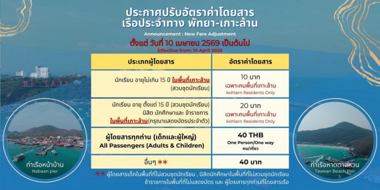 - チョンブリー県パタヤとラン島を結ぶフェリーの運賃が、4月10日より30バーツから40バーツに値上げされます。