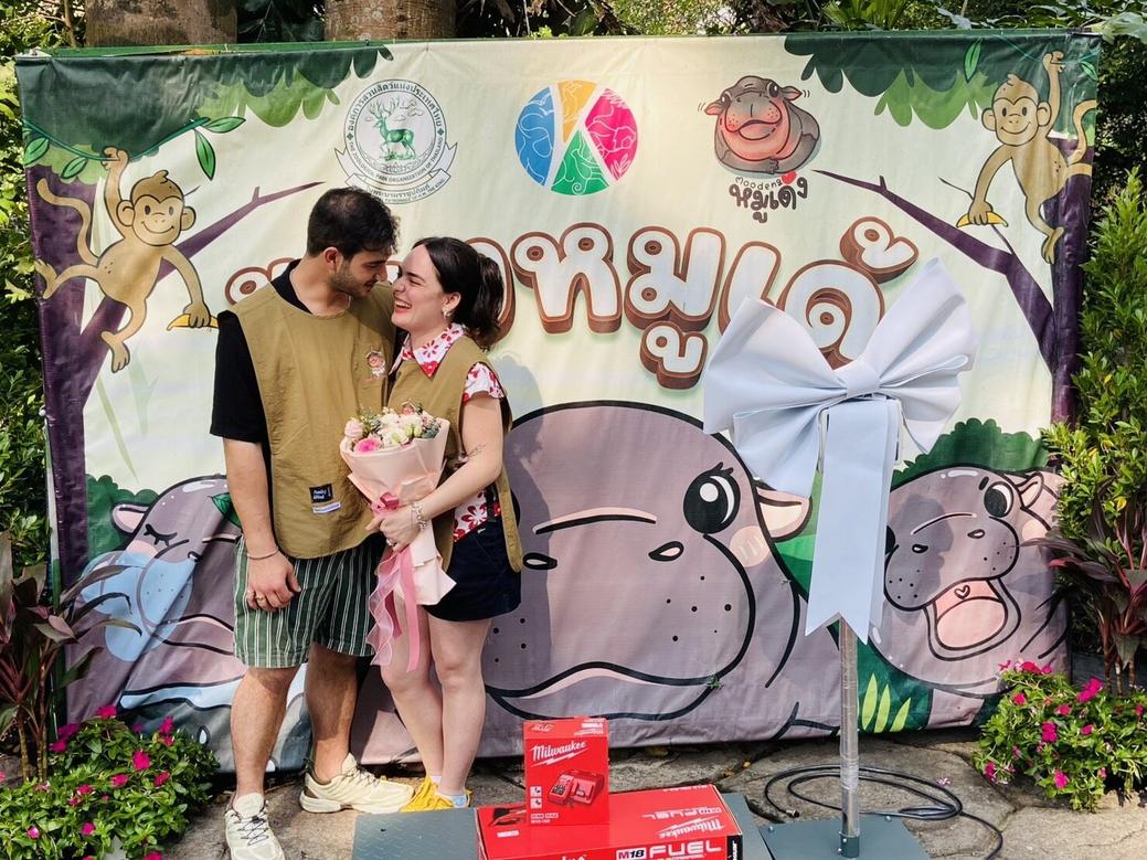 - チョンブリー県のカオキアオ・オープンズーで、イタリア人カップルが人気カバ「ムーデン」の前でサプライズプロポーズを敢行しました。
