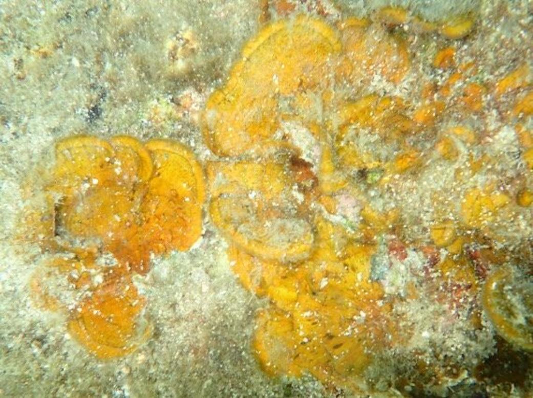 黄金色またはオレンジがかった黄色で、縁に特徴的な濃い斑点と灰色の筋があります。大きさ5.5~6.5cm。平らな葉を持ち、スラートターニー県のナーンユアン島、ヒンウォン湾、メーハーット・ビーチで水深4~14メートルで発見されました。タイの海藻研究の火付け役であるジンダ・ティアムメート教授に敬意を表して命名されました。 - ロブフォラ・ベラスケシー (Lobophora velasquezii)
