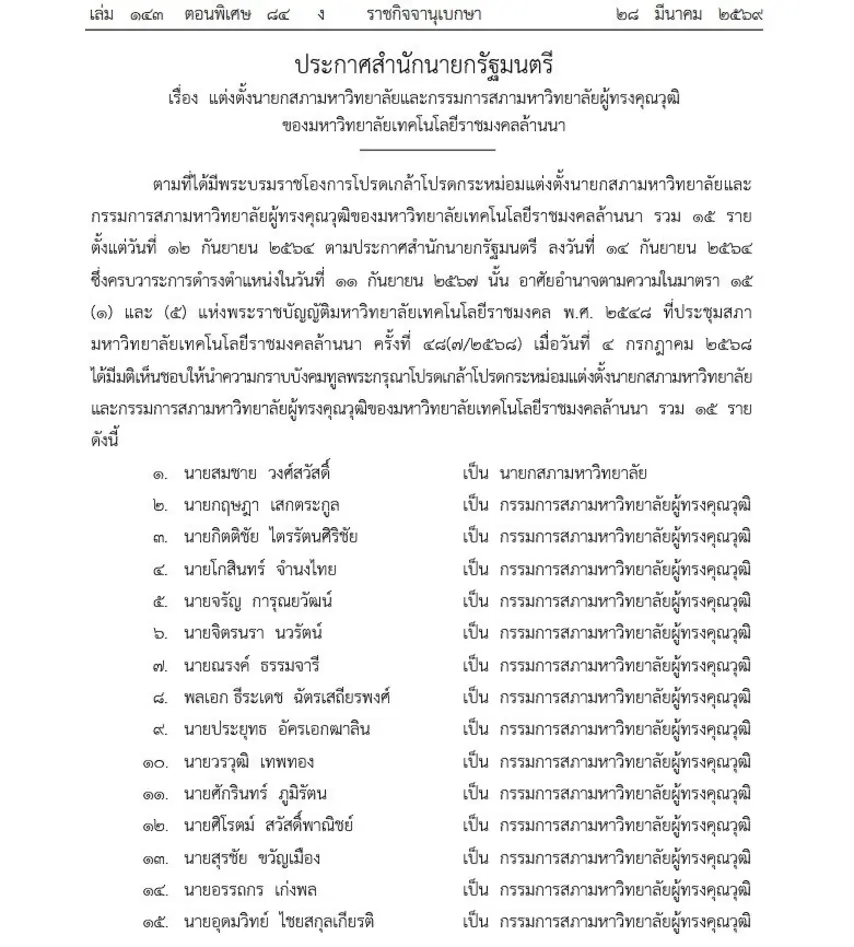- 2026年3月28日、官報にてラチャモンコン工科大学ランナー校の新評議会議長と14名の有識評議員の任命が公示されました。