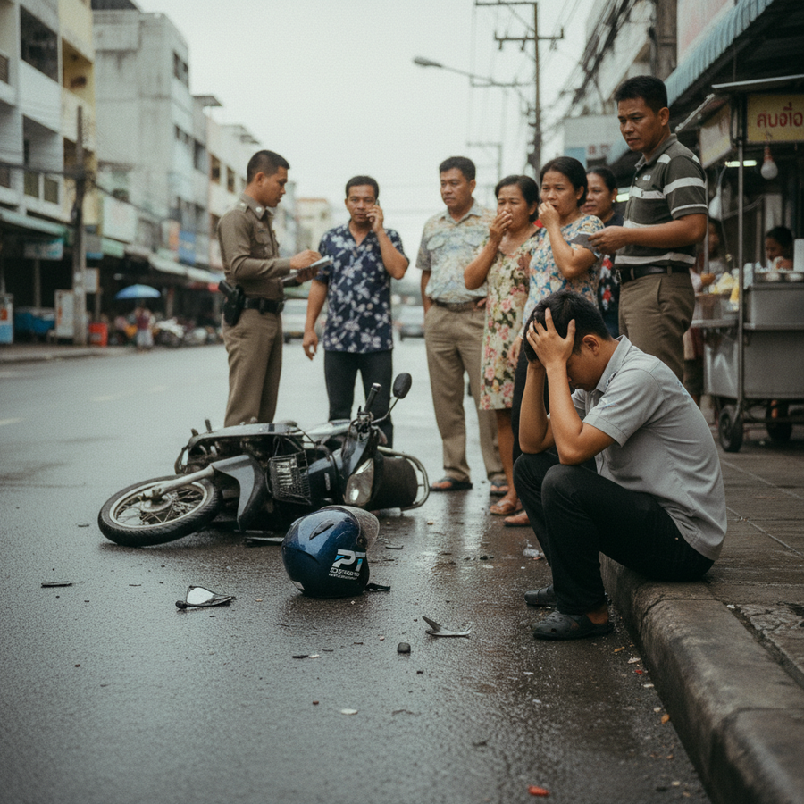 事故現場では、ナイ・ジラユさんが運転していたバンコクナンバーのホンダPCX型バイクが、いすゞ製でバンコクナンバーの自動車運搬用10輪トレーラーの後部に衝突し、ひどく損傷した状態で見つかりました。衝突の衝撃により、ナイ・ジラユさんのヘルメットはトレーラーの上にまで飛ばされており、ご遺体はバイクにまたがったままでした。