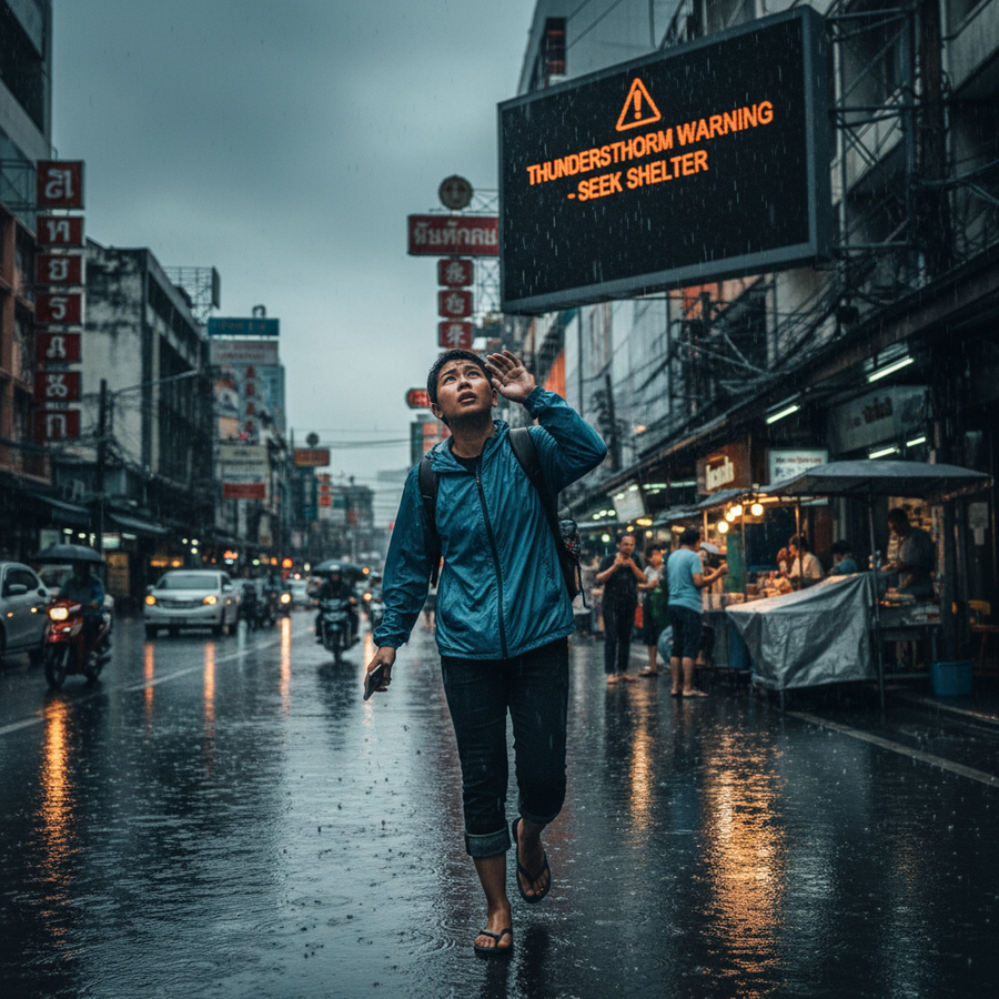 - バンコク首都圏を含む12県で雷雨の確率が10%とされており、体調管理や運転に注意が必要です。