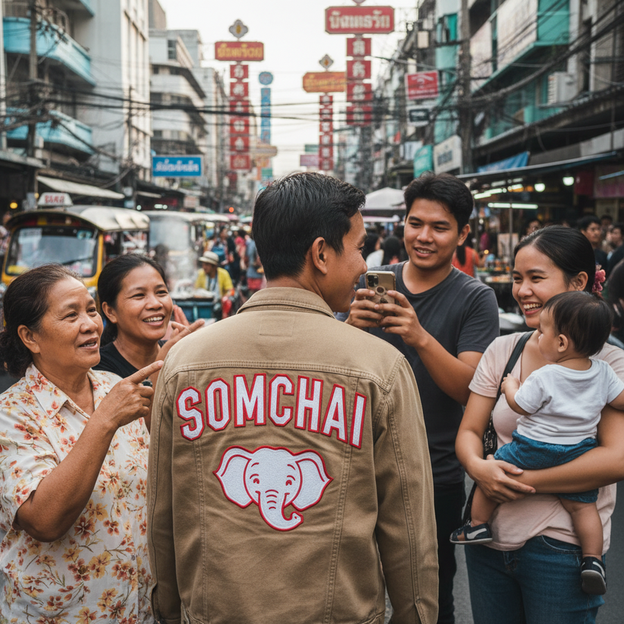 この動画には、スダラット氏が地域住民とのイベントに参加し、水を配っている様子が映し出されています。多くの参加者がいる中で、特に注目を集めたのは、スダラット氏が着用していたグレーのジャケットでした。その左胸には首相府のロゴと共に「ペートーンターン・シナワット首相」という文字が刺繍されていました。