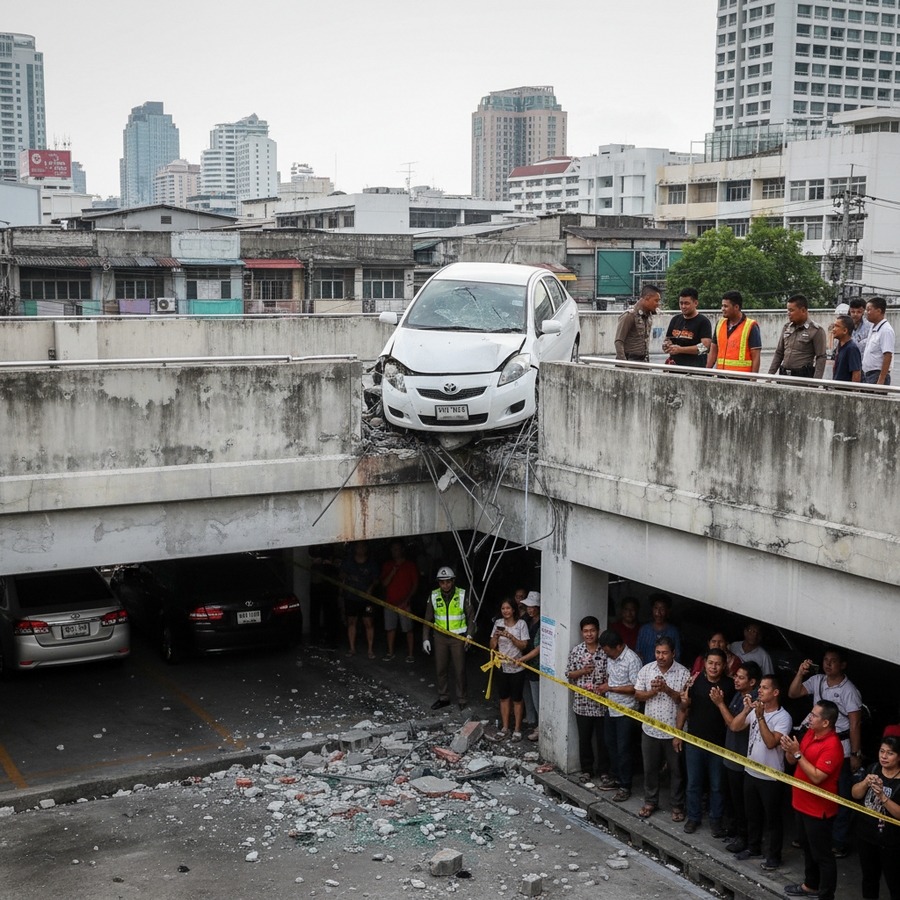 - バンコクのプラ・ラーム4地区にある7階建て駐車場の2階で、乗用車がコンクリートの壁を突き破る事故が発生しました。