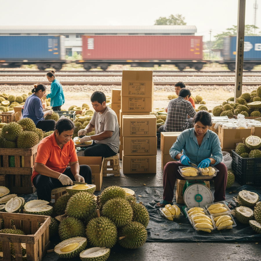 農業経済局(スソコ)のピーラパン・コートーン事務局長は、中老鉄道がタイ産ドリアンの中国への競争力を高める重要な転換点であると述べました。「一帯一路」戦略のもと、2022年から運行を開始したこの鉄道は、高価値経済作物である生ドリアンの輸出に大きく貢献しています。