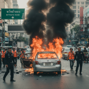 バンコク中心部ウィッタユ通りで乗用車が突如炎上、全焼